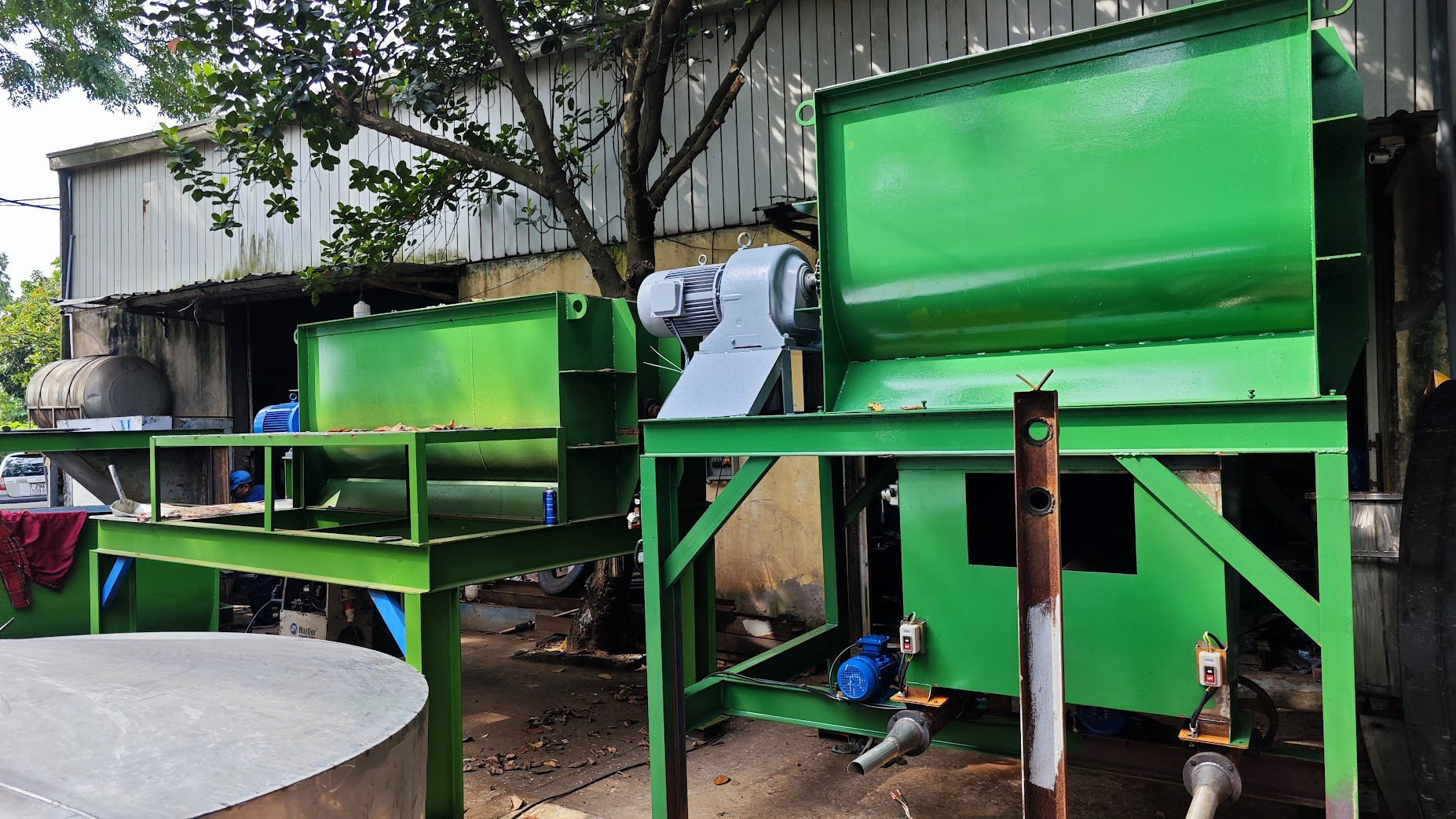 Nguyên lý hoạt động: Khi động cơ quay, cánh khuấy hoặc trục xoắn hoạt động liên tục để đảo đều nguyên liệu bên trong thùng. Sau thời gian trộn định sẵn (từ 5–15 phút), hỗn hợp sẽ đạt độ đồng đều mong muốn và được xả ra ngoài qua cửa xả.